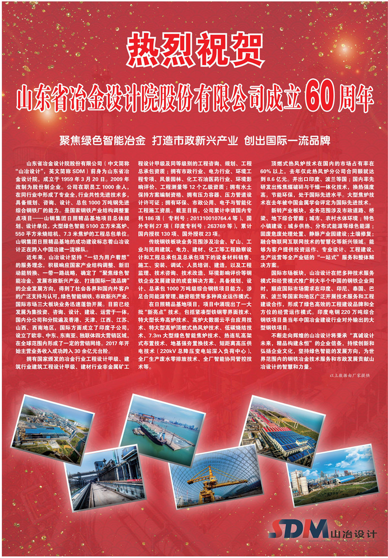 熱烈祝賀山東省冶金設(shè)計(jì)院股份有限公司成立60周年