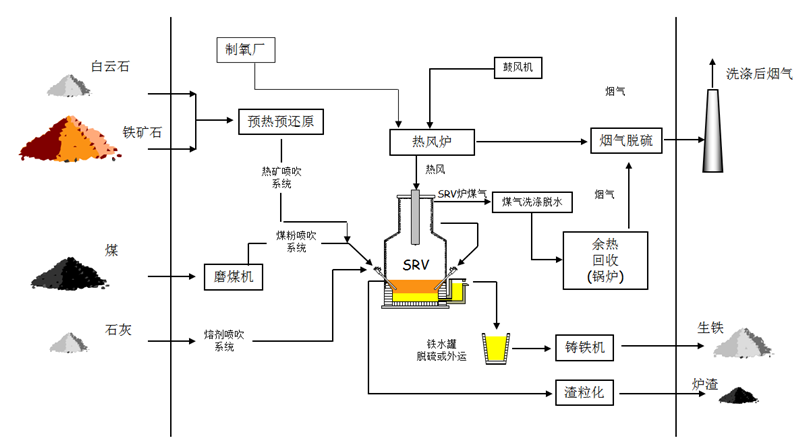 HIsmelt是一種直接熔融還原的煉鐵工藝,是典型的一步法熔融還原工藝。該工藝可直接熔煉經(jīng)預(yù)熱處理的鐵礦粉和其他適合的含鐵原料,并噴吹煤粉作為系統(tǒng)的還原剤及熱量來(lái)源。HIsmelt工藝流程圖如下: